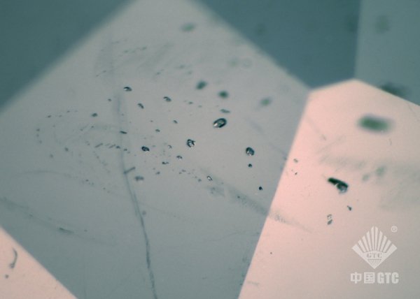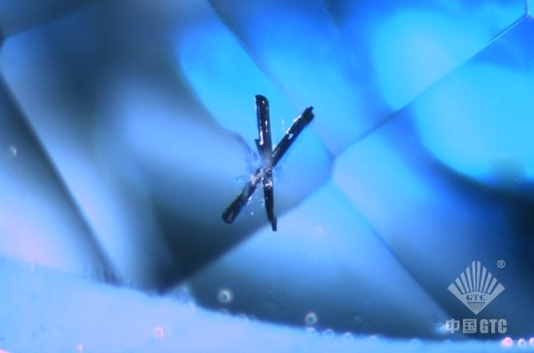 图6 两个黑色柱状包体交叉呈“X”形出现,结合晶形判断,可能是电气石(50倍显微镜下拍摄)。这张照片与上张拍摄于同一宝石内部。