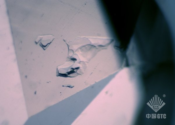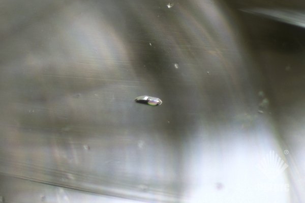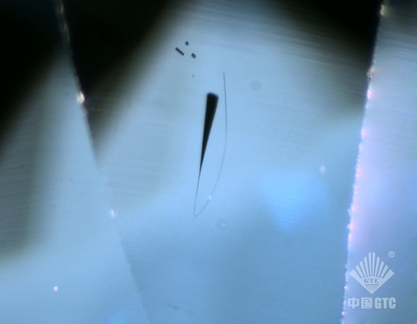 图5 非常罕见,最为神奇的固态包体,从长的三角形尖端引出一根细长的线,呈现金属光泽。左上出现三个细小的气液两相包体(50倍显微镜下拍摄)