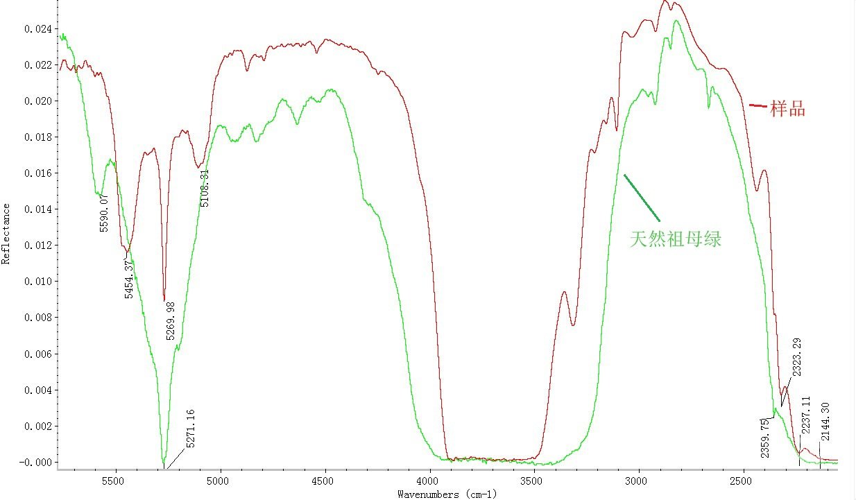 对比天然祖母绿的红外透射光谱:在5600~5100cm-1的波数范围内,天然祖母绿只存在5590、5271cm-1处吸收峰;此外,天然祖母绿在2359cm-1处有较强的吸收峰,由CO2分子不对称伸缩振动造成[1]。