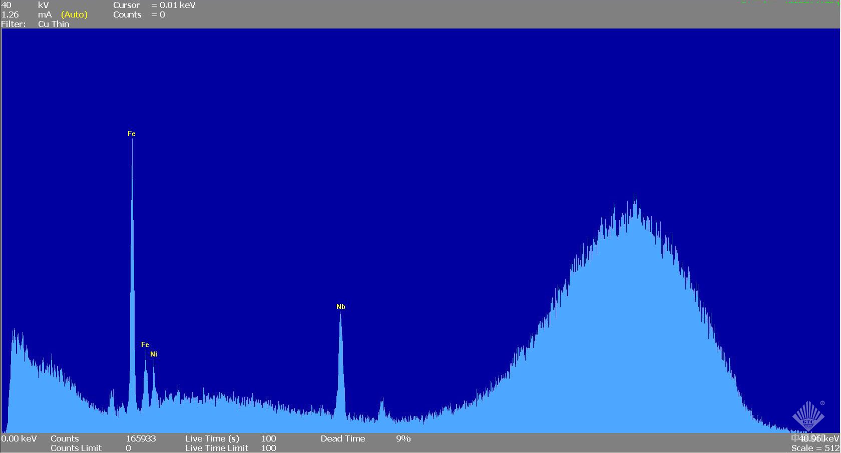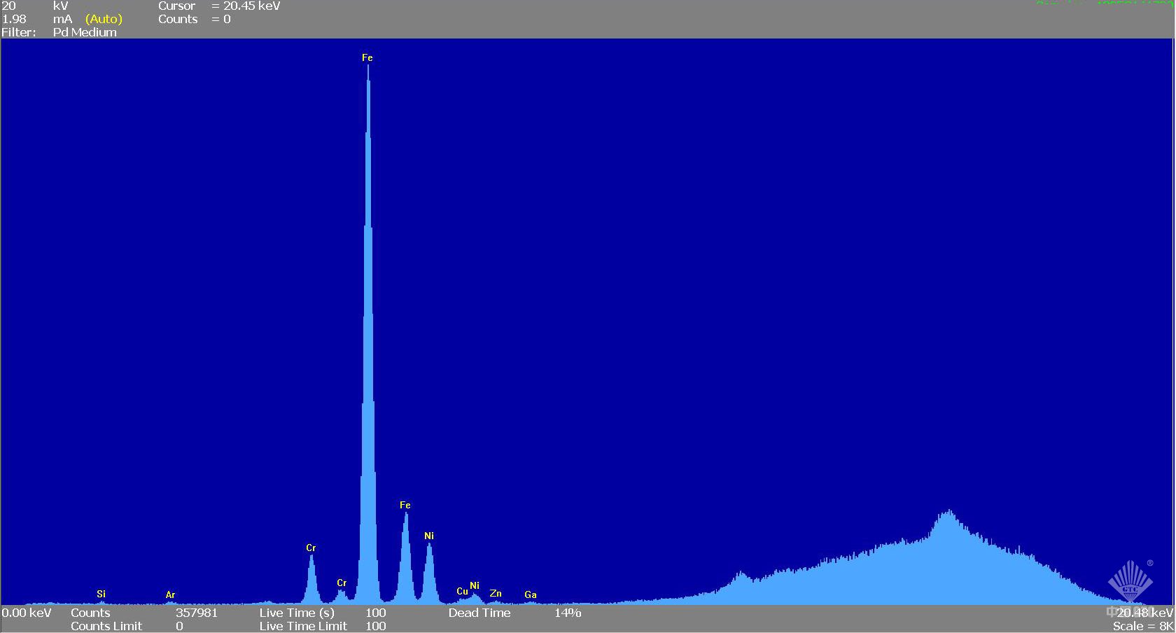 利用X射线荧光光谱仪,在8KV、20KV、40KV条件下对样品进行元素分析,可以得出样品富含Fe、Cr元素,含微量Ni、Cu元素,同时还发现少量Mn元素。(如图3~5)
