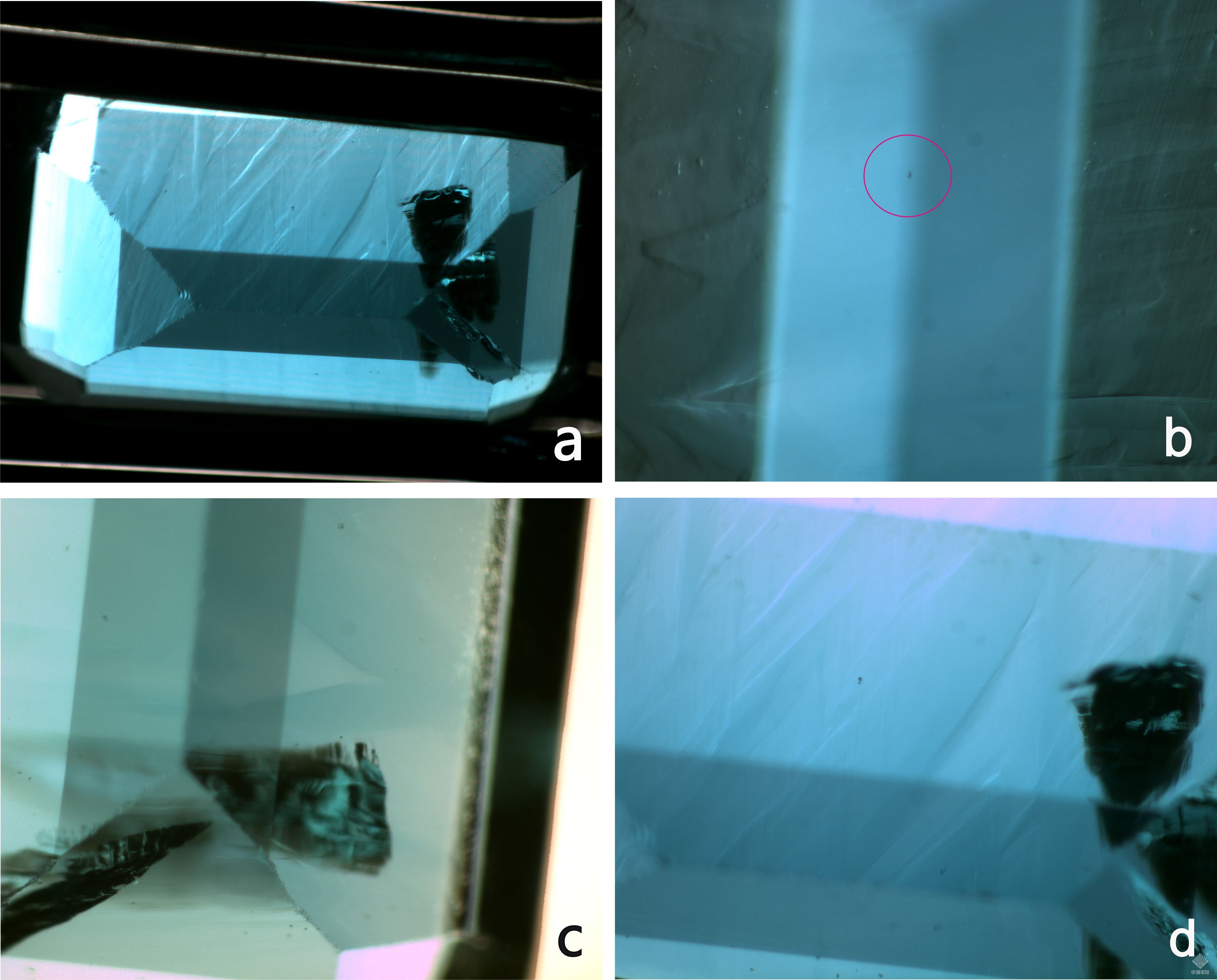 样品内包含裂隙、黑色点状物(b)、不规则色带(c),以及波状生长纹(d)。(如图1)