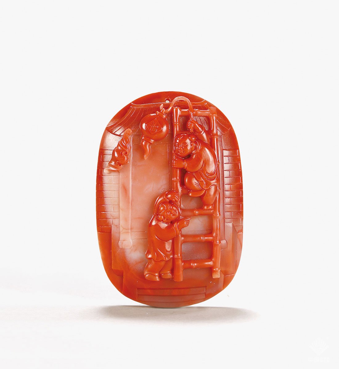 红颜色与白色相伴生,比如常见的红白蚕丝料,其中红白分明者罕见,通过巧妙的设计雕刻,可达到意想不到的艺术效果。