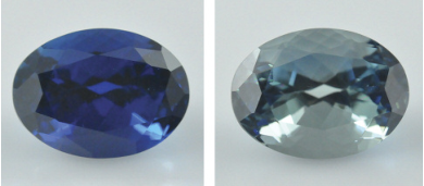 该宝石最突出的特点是它不同寻常的强二色性,显示深蓝色和浅蓝绿色(图2)。其饱和的深蓝色类似于高品质的蓝宝石。它的强二色性让人联想起Maxixe型(辐照)绿柱石,尽管它们的二色性颜色通常是深蓝色和无色。高饱和蓝色沿电子射线可见,淡蓝绿色常光线下可见。这种颜色吸收现象与海蓝宝石相关,相反的现象发生在Maxixe型绿柱石,其在电子射线下出现无色,常光线下可见深蓝色(R. Webster, Gems, 5th ed., Butterworth-Heinemann, London, 1994, pp. 124–127)。