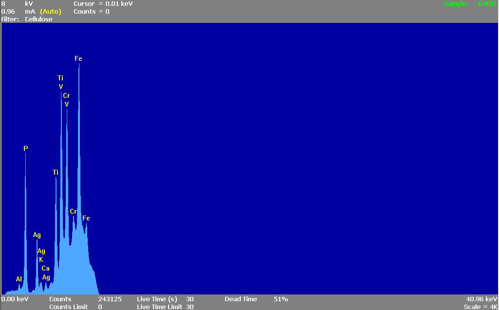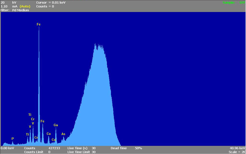 X射线荧光光谱仪分析样品的元素,主要元素为Fe、P、Al、Cr、V、Ti,Cu含量较低。