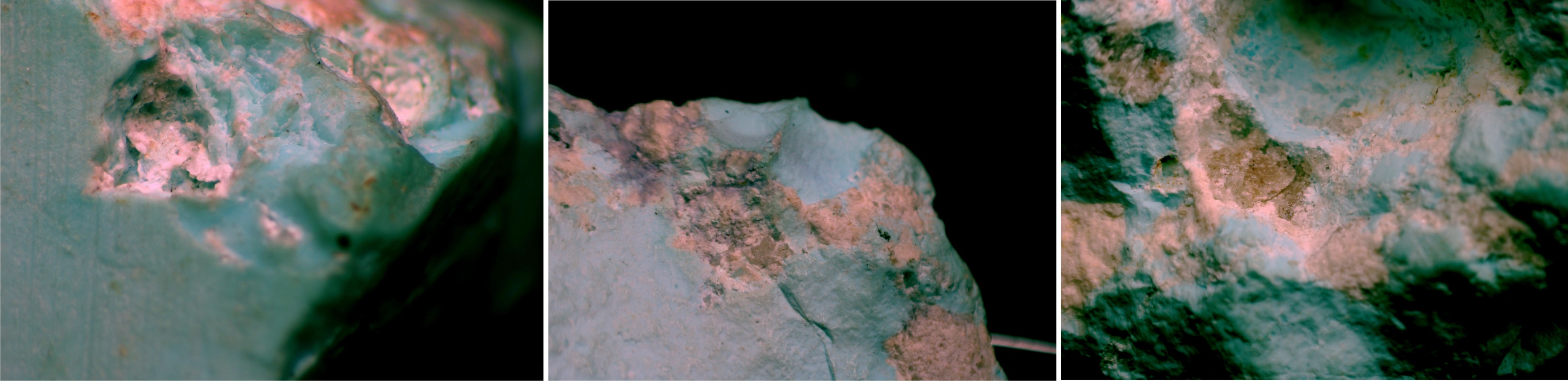 观察发现,浅绿色绿松石与白色高岭石界限分明,其不同颜色部位红外粉末压片谱图峰位单一,可知高岭石与绿松石共生;显微镜下观察,白色高岭石部分另含透明石英矿物,基本可排除粉末压制可能。综合判断,该原料为天然绿松石原料。
