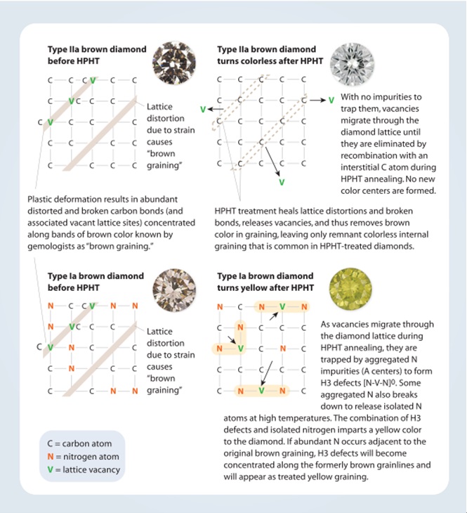 图4 高温高压处理的效果取决于处理前钻石的类型。IIa型棕色钻石可以被褪色是因为与棕色相关的塑性变形对高温高压非常敏感。通常情况下, 没有N杂质就没有办法形成新的色心。相反地,Ia型棕色钻石含有许多氮杂质,在处理过程中会捕获空穴来形成H3缺陷,也会破裂形成单原子氮。这两种过程都会形成新的黄色体色。