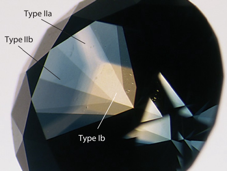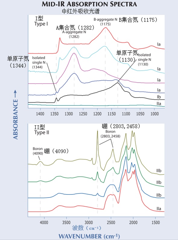 Kaiser和 Bond (1959) 是最早将I型钻石中氮杂质存在与钻石的某些特性关联起来(比如黄色体色,蓝色荧光和某种特定的红外吸收光谱)。其它研究确认了他们的发现(Anderson, 1961; Lightowlers and Dean,1964)。此后不久, Dyer et al. (1965)用红外光谱仪来区分多氮(Ia型)和孤氮(Ib型)钻石。测试中,大多数(>95%)的天然钻石都是Ia型,只有极少数是Ib型(Davies, 1977)。有些Ib型钻石颜色异常黄,对应钻石级别中的“金丝雀”(Anderson, 1962; Collins,1980)。Custers (1952, 1954)发现II型钻石在自然界也非常罕见,并提出将它们分为两种类型,IIa型和IIb型。IIb型钻石是蓝色的(有时是灰蓝,灰或棕色),有良好的导电性(Custers, 1955; Anderson, 1960, 1962)。后续研究证明了硼是改变IIb型钻石性质的杂质元素(Wentorf and Bovenkirk, 1962;Chrenko, 1973)。