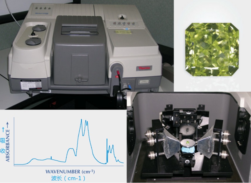 图5 GIA用红外光谱仪(型号:Thermo Nicole 6700)(左上,分辨率1cm-1,溴化钾分束器,中红外范围)确定钻石类型。刻面钻石(右上)台面朝下放在特制的聚光台上,使红外光束从钻石腰部穿过(右下),测试出可以确定钻石类型的吸收光谱(左下)。C. M. Breeding 和Robison McMurtry拍摄。Ia型钻石在世界各地主要的钻石矿床都有发现,但是最著名的矿床位于南非。黄色Ia型钻石通常被称为开普系列钻石(King et al., 2005)。而澳大利亚阿盖尔矿区的典型出产则是的粉色Ia型钻石(King et al.,2002)。Ib型钻石分布于所有主要矿床中,但最著名的矿床位于印度、巴西和南非 (King et al., 2005)。IIa型钻石也分布于所有主要矿床中,但主要来自于印度Golconda地区。许多IIa型粉钻来自巴西、非洲和印度(King et al., 2002)。IIb型钻石分布相对没有那么广泛,大多数来自印度和南非的Cullinan(前总理)矿区(King et al., 1998)。