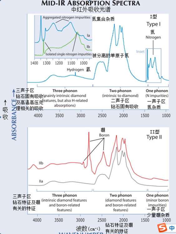 要确定钻石类型,必须要检测内含的杂质。最常用的仪器是红外光谱仪(FTIR, 如图5;Clark et al., 1979)。其他几种设备,比如电子顺磁共振光谱仪/电子自旋共振光谱仪(EPR/ESR),和次离子质谱分析仪(SIMS)化学分析,为分析钻石中的杂质提供了可能性。然而这些方法复杂、昂贵并有破坏性,对氮和硼杂质的结构能提供的信息也很少。相比之下,红外分析法无损检测,相对花费少(光谱仪),能提供大量钻石晶格缺陷的相关信息。简单来说,红外光谱仪是发射一束红外线通过钻石,并测量它吸收了多少(在多少波长处)的仪器。氮硼杂质的结构和周围碳原子的互相作用会在电子光谱的红外区产生特征图谱,也就是说每一种与类型相关的氮和硼杂质都会导致一种或一些特征的吸收带。钻石晶格本身也会产生特征吸收,所以红外光谱仪可以鉴别样品是否是钻石,内含多少杂质以及钻石类型。用红外光谱仪检测杂质,我们首先要了解钻石的红外光谱(图6)。纳米通常作为电磁光谱紫外和可见区波长的单位,红外区通常用波数【cm-1;换算公式:10 7/(波长nm)=(波数cm-1)】。钻石在中红外区(~4000-400cm-1)有非常重要的吸收特征。运用在钻石中,这个范围被分成三个区,一、二、三声子区,这种分区基于当钻石晶格中碳原子间的化学键受红外激发时,它们如何振动(Zaitsev, 2001).图6显示了I型和II型钻石中的这些分区。