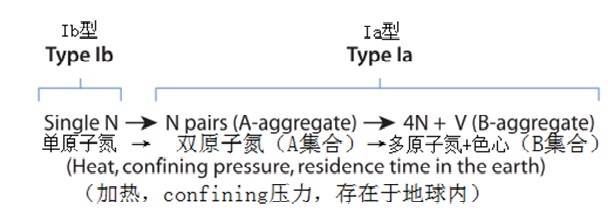 大部分钻石有多于一种类型的典型特征,许多因素导致了混合型钻石光谱的出现。首要因素是氮元素聚集的过程。钻石在结晶时,所有氮原子在晶格中都是单个出现的(Collins et al., 2005)。随着钻石长时间处于地底高温高压的环境中,氮原子在晶格中移动并慢慢聚集起来。当两个氮原子结合起来时,就形成了A集合,当两个A集合结合起来(中间有一个空穴),就形成了B集合。氮集合的这种形成方式就解释了Ib型钻石相对于Ia型钻石更罕见的原因。