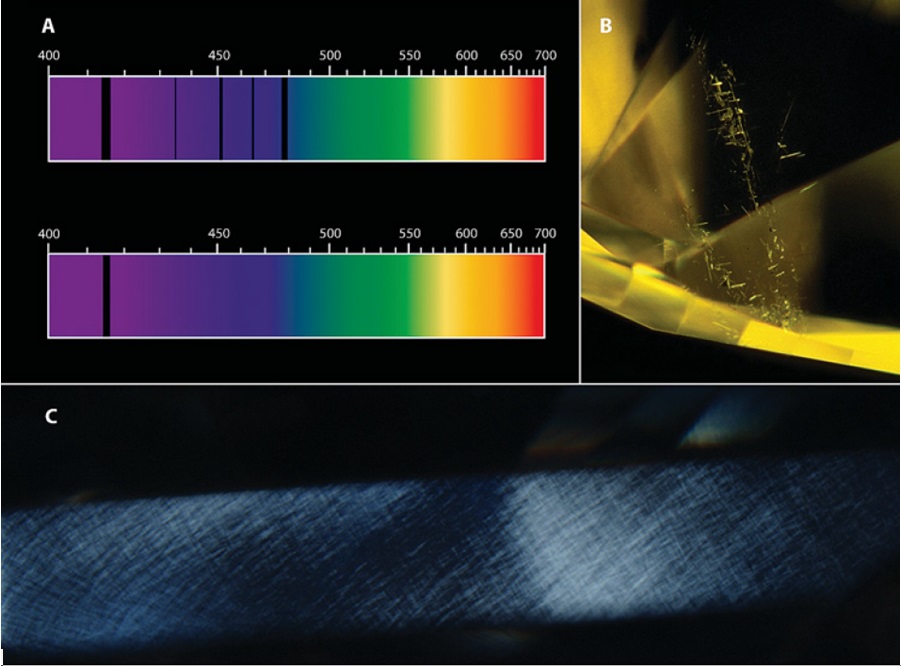 钻石培育和处理技术的最新发展使得检测更加依赖精密仪器了,但实践表面许多常规仪器也可以有效说明钻石的性质,帮助确认钻石类型,或是确认处理或合成。比如对于短波紫外可以透过的无色钻石,偏光图案呈十字交叉型证明它可能是IIa型,需要送去实验室进行进一步检测以确认是否经过高温高压处理。类似的还有,具有导电性的蓝色钻石是IIb型,也需要实验室进一步测试。如果IIb型蓝色钻石在显微偏光下没有偏光图案,他就有可能是合成的。颜色浓郁的黄色钻石用分光镜观察,看不到开普线,那就有可能是Ib型。如果合成钻石没有颜色分区,并出现类似于图9B的针尖状包体,它就有可能是天然Ib型钻石。这只是基础测试可以为证明钻石类型提供证据的少数情况。关于类型的信息可以帮助宝石学家估计钻石经过处理或是合成的可能性,或是确认钻石是天然和天然颜色的。随着世界范围内处理和合成技术的发展,我们强烈鼓励宝石学家提高警惕,如果有任何怀疑都应将钻石送至宝石实验室,