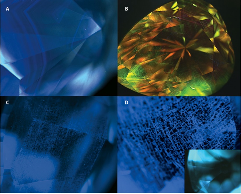 包体和偏光图案:宝石显微镜。大多数钻石在生长过程中都会包裹住一些晶体,其中一些包体是特定钻石类型的显著特征(见 Crowningshield, 1994)。Ib型天然钻石常于黄色区域可见一片针尖状包体,其他类型钻石中很少见(GIA工作组观察图像 图 9B)。Ia型钻石常见纹理清晰的(fine-grained)云雾形成十字交叉型,因其内含丰富的氢杂质(例如“星彩”钻石,见Wang 和Mayerson, 2002; Rondeau 等等, 2004, and references therein)。合成Ib型钻石在放大镜下可见特征的颜色分区,或是熔化的金属包体(Shigley et al., 2004),无消光的钻石是各向同性的,正交偏光下全暗,尽管如此,大多数天然钻石在一定程度上表现出晶格变形,这种晶格变形是结晶过程中或快速增长的塑性变形期间形成的,因此,用显微偏光观察会看到许多偏光图像和干涉色。其中一种交叉阴影线被称作“Tatami”图像,被认为是II型天然钻石和颜色处理钻石 (Smith et al.,2000; 图 9C)的特征。榻榻米图案也可以在液氮温度下在某些纯IaB和Ib型钻石中观察到(Chalain, 2003; GIA staff observations)。迄今为止,任何类型的合成钻石都未曾观察到这种图案。