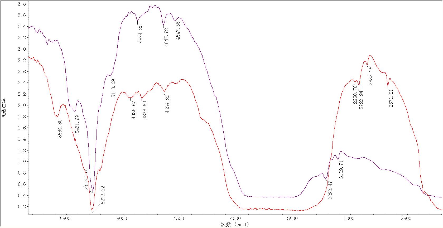 对比天然祖母绿的红外透射光谱:在5600~5100cm-1的波数范围内,天然祖母绿只存在5584、5277cm-1处吸收峰。